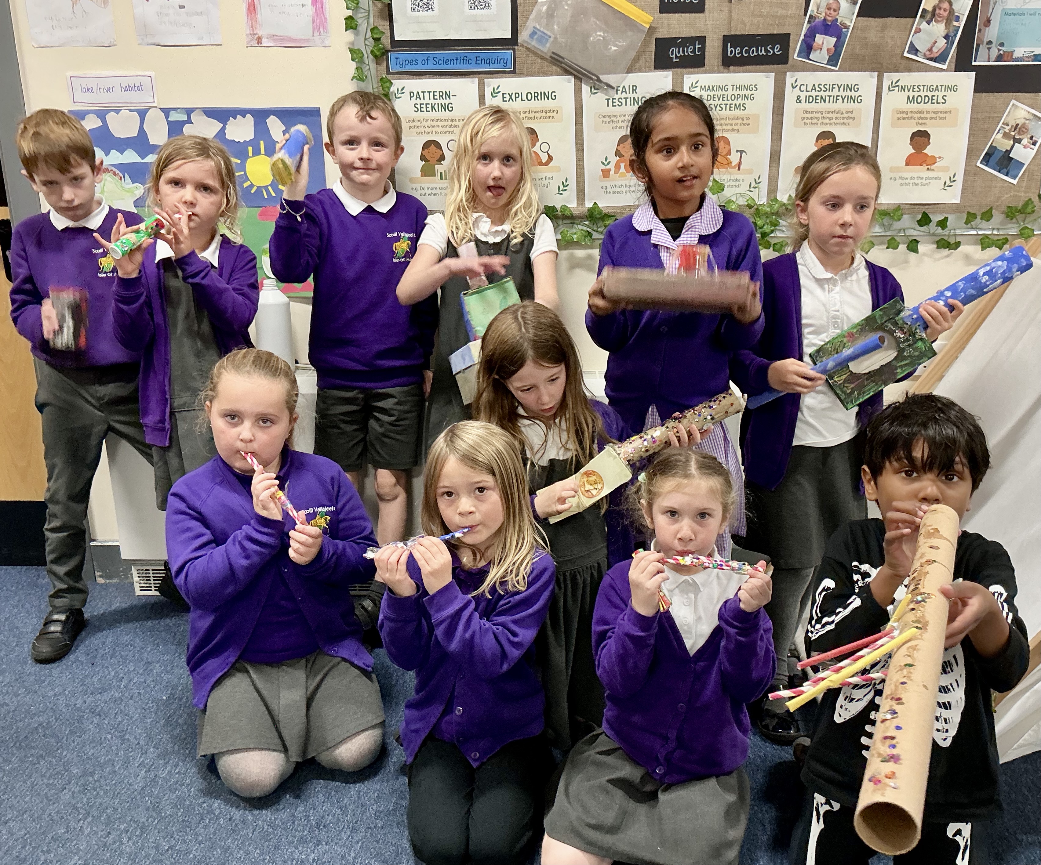 In science, we’ve been investigating sound. We explored whether different materials make different sounds and experimented with changing pitch using bottles filled with different amounts of water. Using everything we’ve learned so far, we designed our own musical instruments—ready to build over the next fortnight.