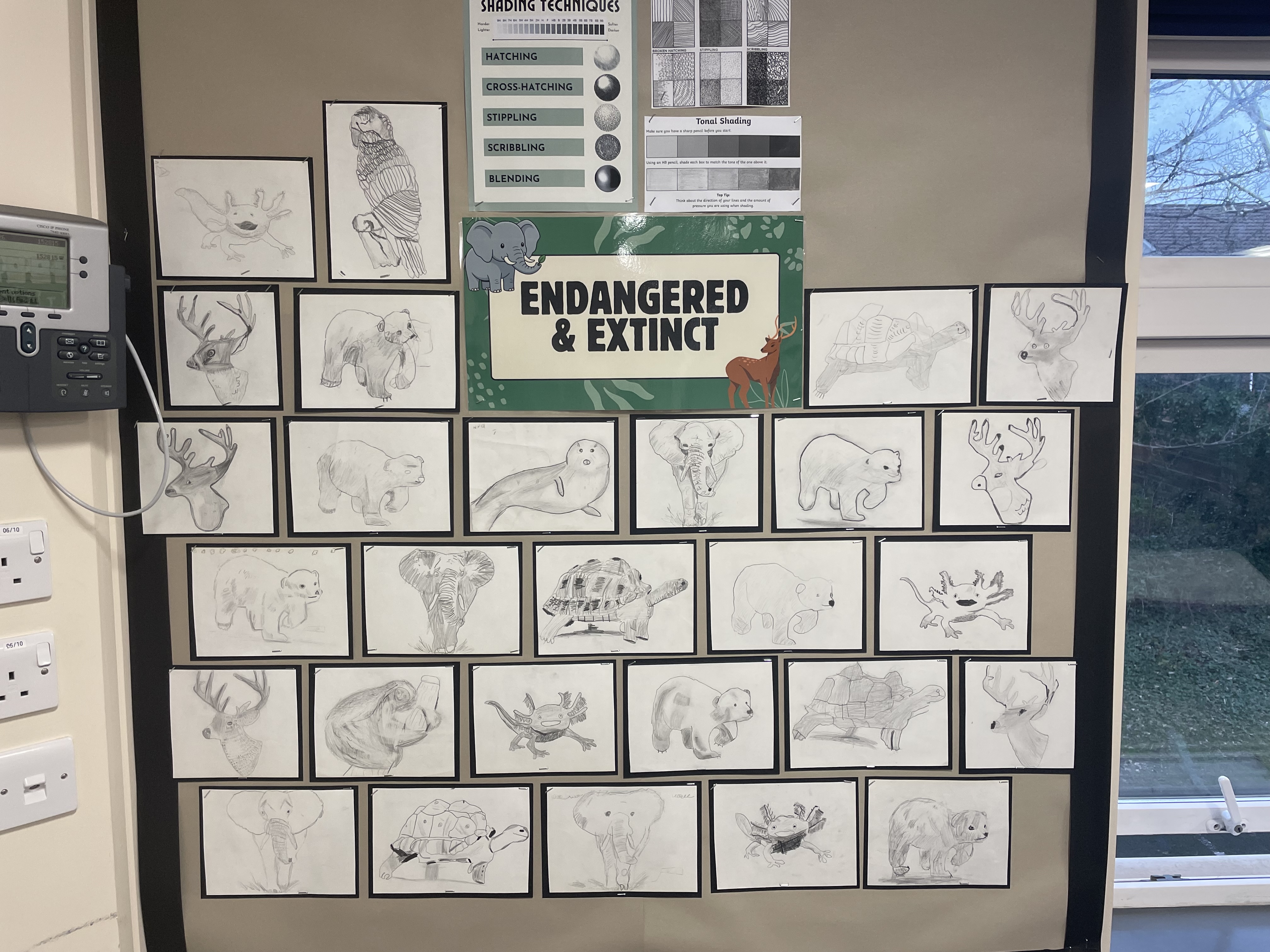 This week we learned all about sketching pencils and what the different numbers and letters mean. Once we had experimented with different tones and techniques, we created our own sketches of endangered animals based on an existing sketch. Look how fantastic our display board looks!